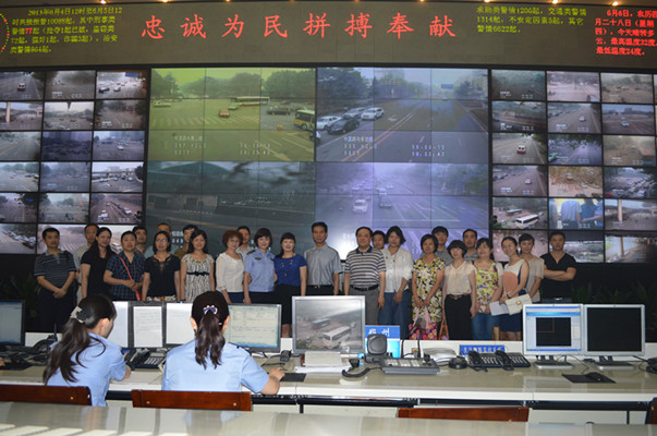接著大家來到鐫刻有“忠誠為民、拼搏奉獻”字樣的全市交通路況顯示屏前。大屏幕上顯示著鄭州市各個主要單位、部位和重要道路交叉路口的即時信息,具有GPS定位功能的警車在不停地移動,視頻畫面依序切換,“原來每時每刻都有幾百輛警車在街面巡邏,每個路口都有監(jiān)控。看樣子,鄭州市的安保工作還是有保障的,以后更要規(guī)范自己的言行,遵守交通規(guī)則”大家很是感慨。