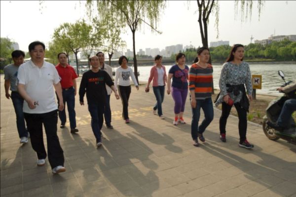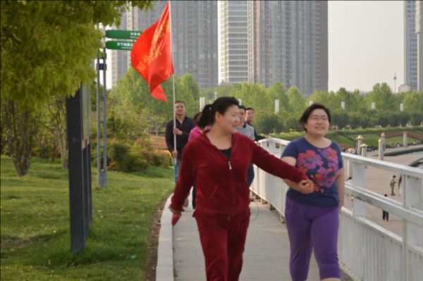 4月28日下午4:00,斜陽濃濃,微風徐徐,在集團公司領導秦廣遠、付立文等同志的帶領下,近40名員工在樓下準時集合,排成整齊的健步走隊伍,揮舞著“鄭州市建設投資集團”的旗幟,精神抖擻地沿著如意湖畔闊步前行,在運動中體驗健康和快樂。