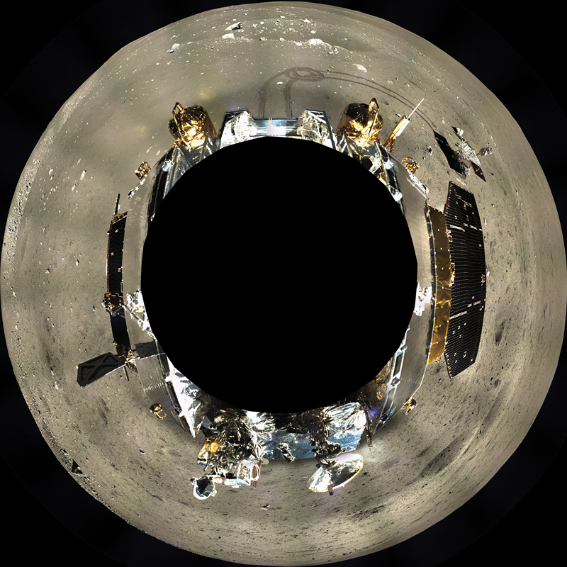這是嫦娥三號地形地貌相機(jī)拍攝的著陸器周邊360°范圍的全景鑲嵌影像圖,采用方位投影方式表達(dá)(2013年12月17日至12月18日攝)。新華社發(fā)